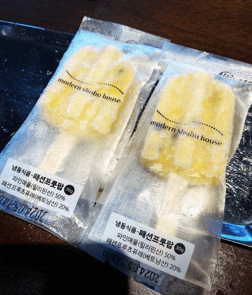 식사 후 후식으로 과일 아이스크림 바가 준비되어 있는데요~ 저희는 패션프룻 바를 먹을수 있었네요.