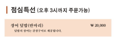 점심특선인 장어덮밥과 대표 메뉴인 장어구이 (소금구이/고추장구이/간장구이), 장어탕 등을 드실수 있는데요.
