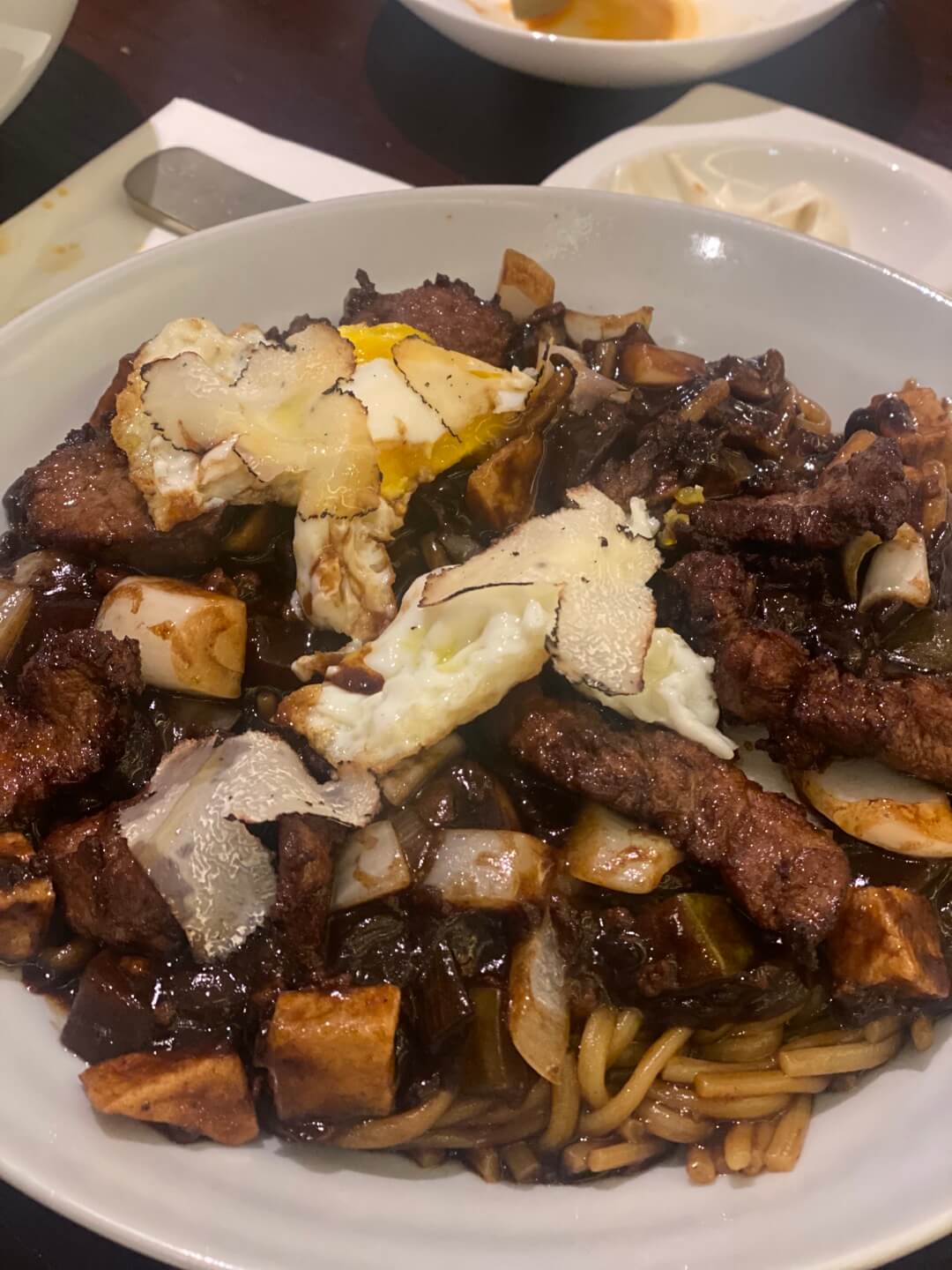 아래 사진과 같이 짜장면+스테이크+계란후라이+트러플 버섯의 구성으로 굉장히 고급스러운 풍미와 맛으로 가득한 메뉴입니다.