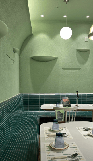 간판도 아주 심플하면서도 따뜻한 그런 느낌에 내부 인테리어도 초록 파스텔톤과 베이지로 여성분들이 특히나 좋아할 만한 그런 분위기 입니다. 주방도 오픈되어 있어 요리하는 것을 직접 볼 수 있고요.