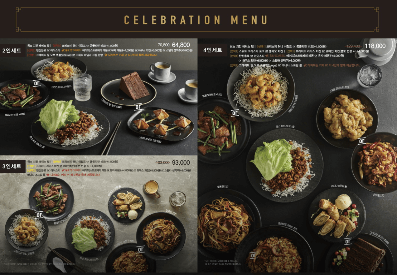 중식의 미국화...퓨전음식을 지향하는 만큼 주 재료(비프, 포크, 치킨, 슈림프 등)에 따라 메뉴 구성이 다양합니다.