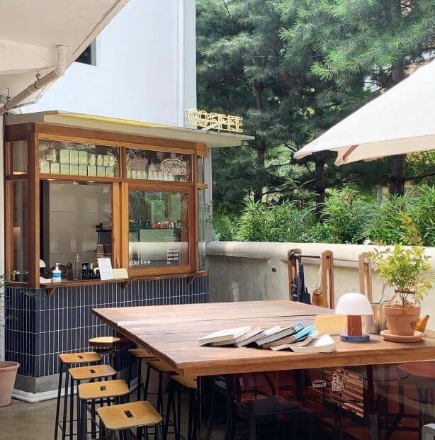 정문을 들어가면 우측 실내로 들어가는 입구와 함께 이렇게 야외 테이블이 눈에 들어옵니다. 잠깐 야외에서 식사할까 고민하다 너무 더운 날씨탓에 바로 실내로 고고!
