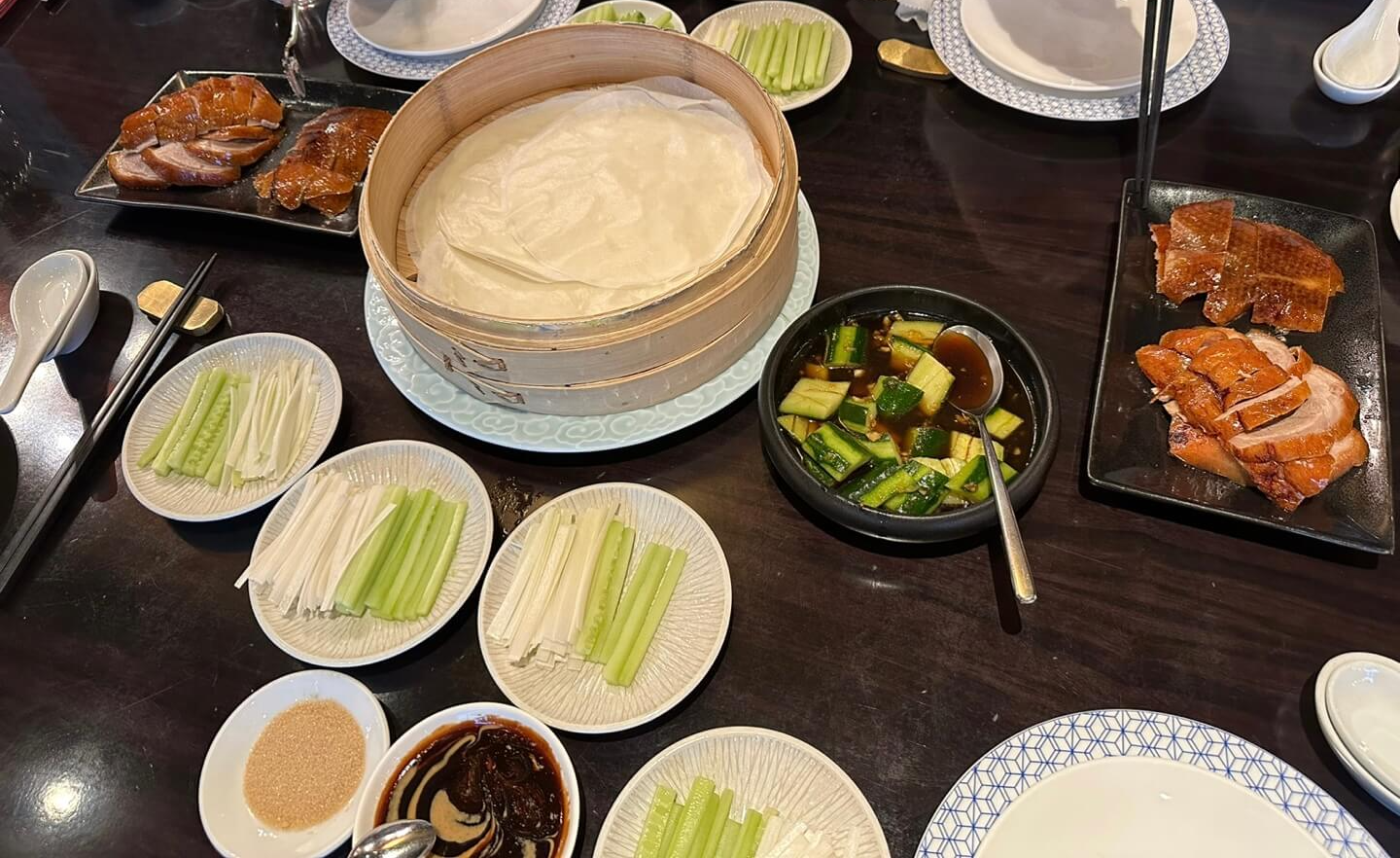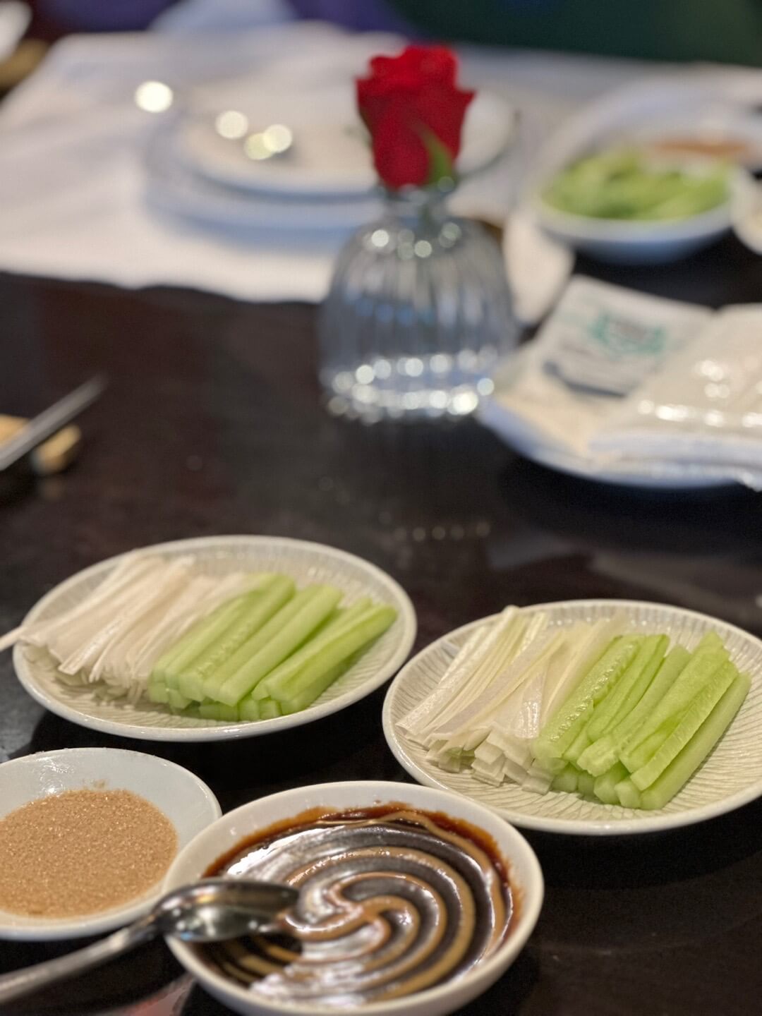 입맛을 돋구기에 충분한 딤섬이었네요- 북경오리가 준비되는동안 아래와 같이 소스와 설탕, 야채 (오이, 파)가 준비되고요- 고기를 싸 먹을수 있는 야빙이 함께 준비되어 나옵니다. (야빙만 따로 주문 가능해요!)