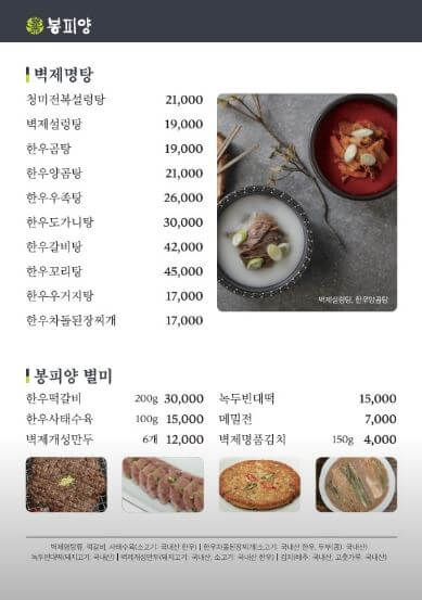 봉피양 메뉴이고요~ 메인 메뉴는 돼지목심 본가비와 봉피양 평양냉면이 되겠습니다 ㅎㅎ
