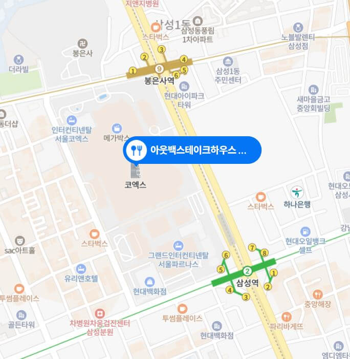 내돈내산 오늘의 맛집, 브런치 뿐만 아니라 점심식사로도 훌륭한 샌드위치/파니니 맛집 카페마마스 코엑스점! 위치는 봉은사역 7번출구로 나오면 입구 오른쪽에 바로 보입니다. 카페마마스는