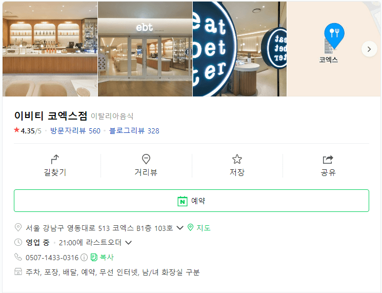 저는 ebt를 코엑스에서 처음 봤는데요~ ebt는 신사동 가로수 길에도 있고 스타필드 하남점에도 입점되어 있는 이태리 레스토랑 이더라고요. 기본 정보는 아래 사진에서 확인 가능합니다.